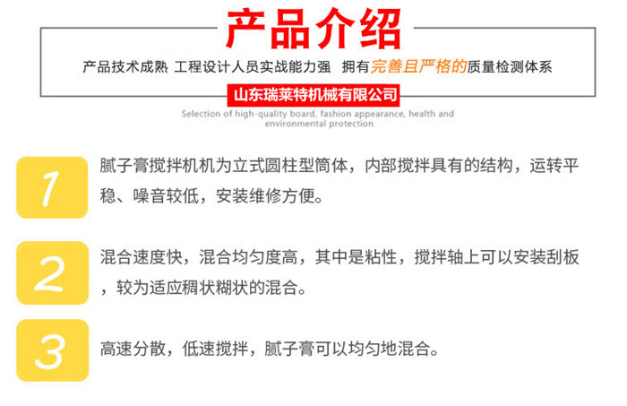 立式膩子膏攪拌機內(nèi)有高速分散盤,采用高速分散低速攪拌的原理,使物料攪拌較快較均勻,電動出料,輕輕一踩腳踏開關(guān)即可放出攪拌好的物料,內(nèi)加刮板,攪拌葉片與桶壁間隙小,殘留較少,出料較干凈。干粉原材料由螺旋上料機上料,液體可以由水泵上料,使用方便,大大降低了勞動強度,提升了生產(chǎn)效率??筛鶕?jù)不同物料的實際需求定制碳鋼及不銹鋼材料。